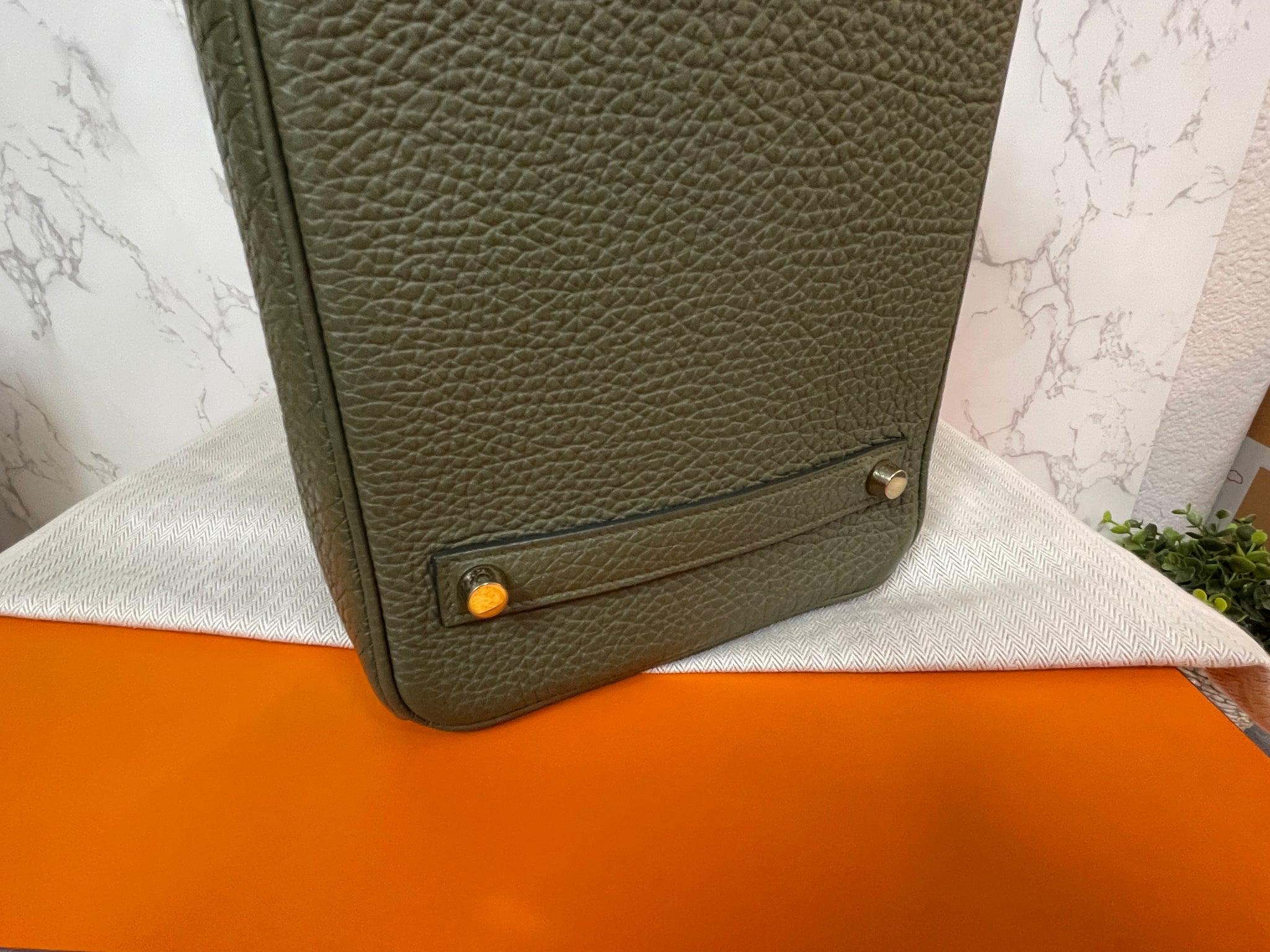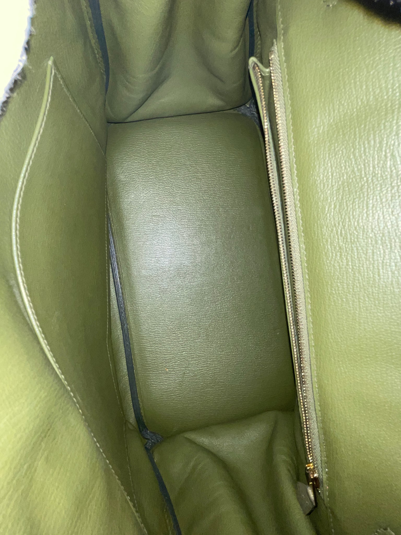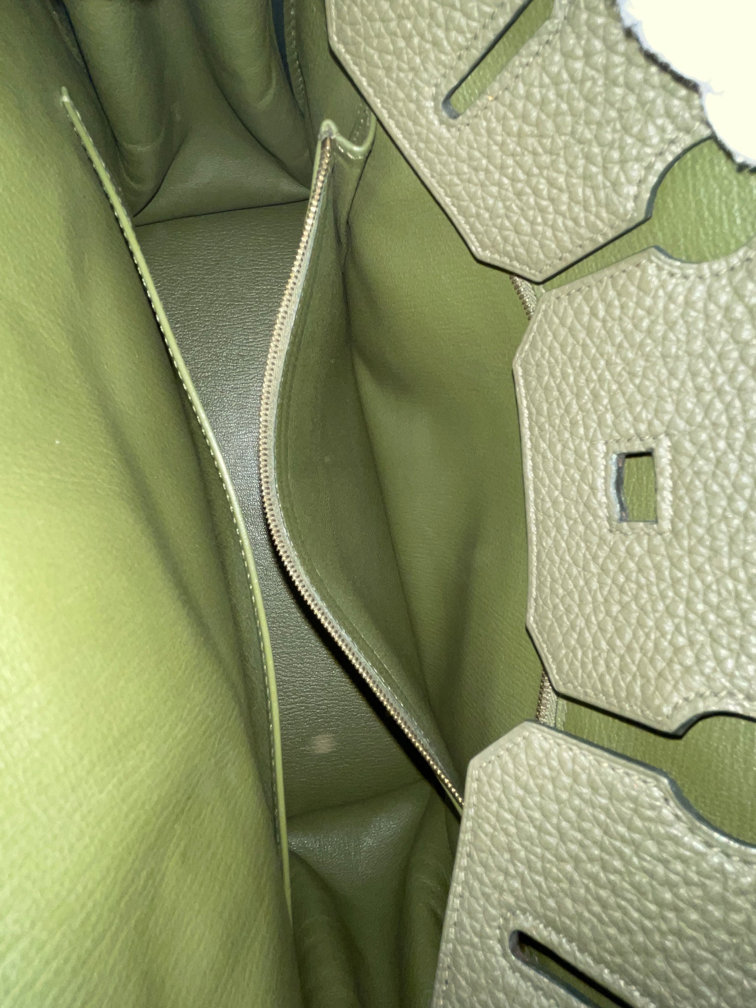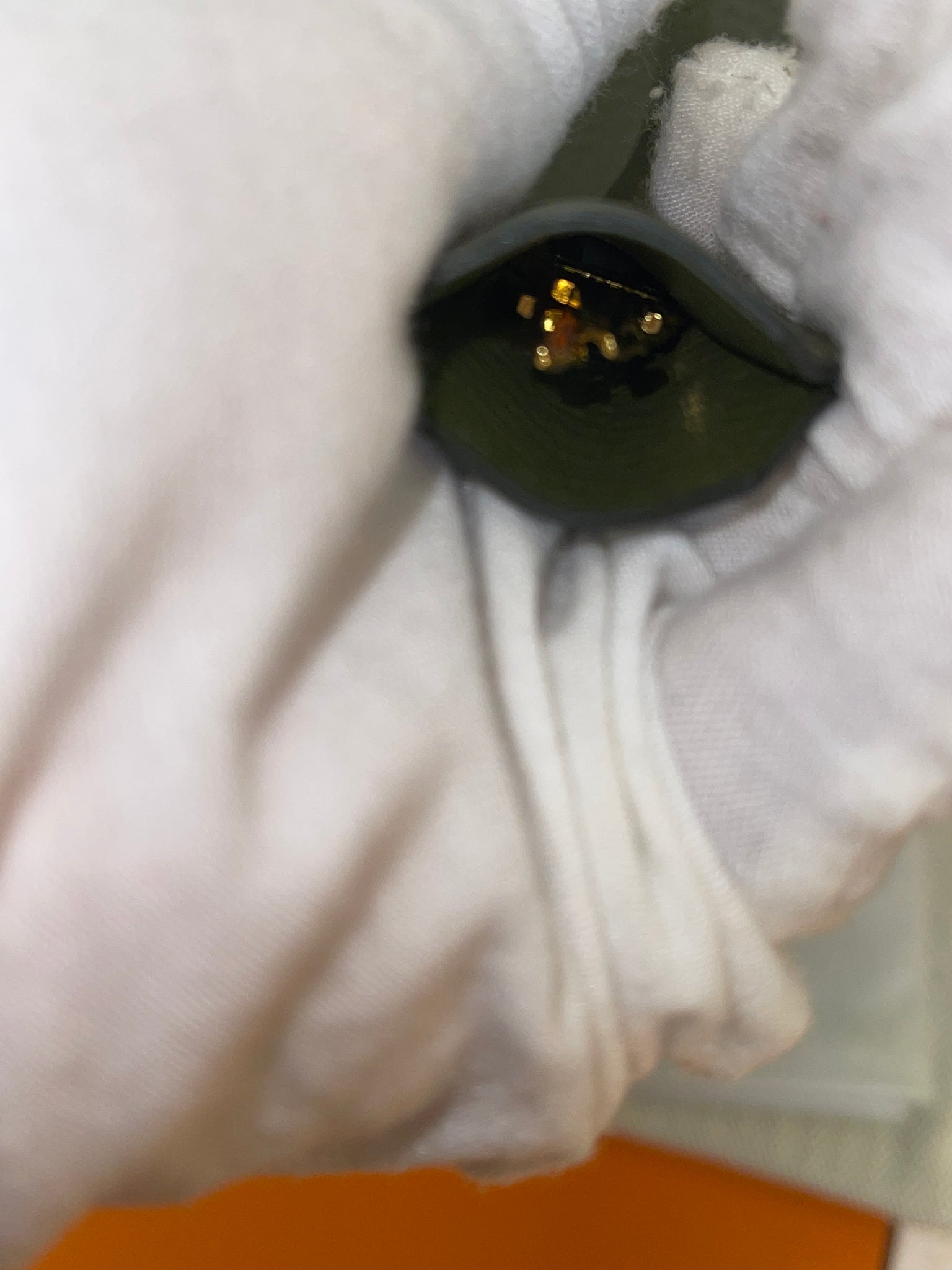 The Interior is lined in Vert Olive chevre with one zip pocket with a Hermes engraved zipper pull and an open pocket on the opposite side.