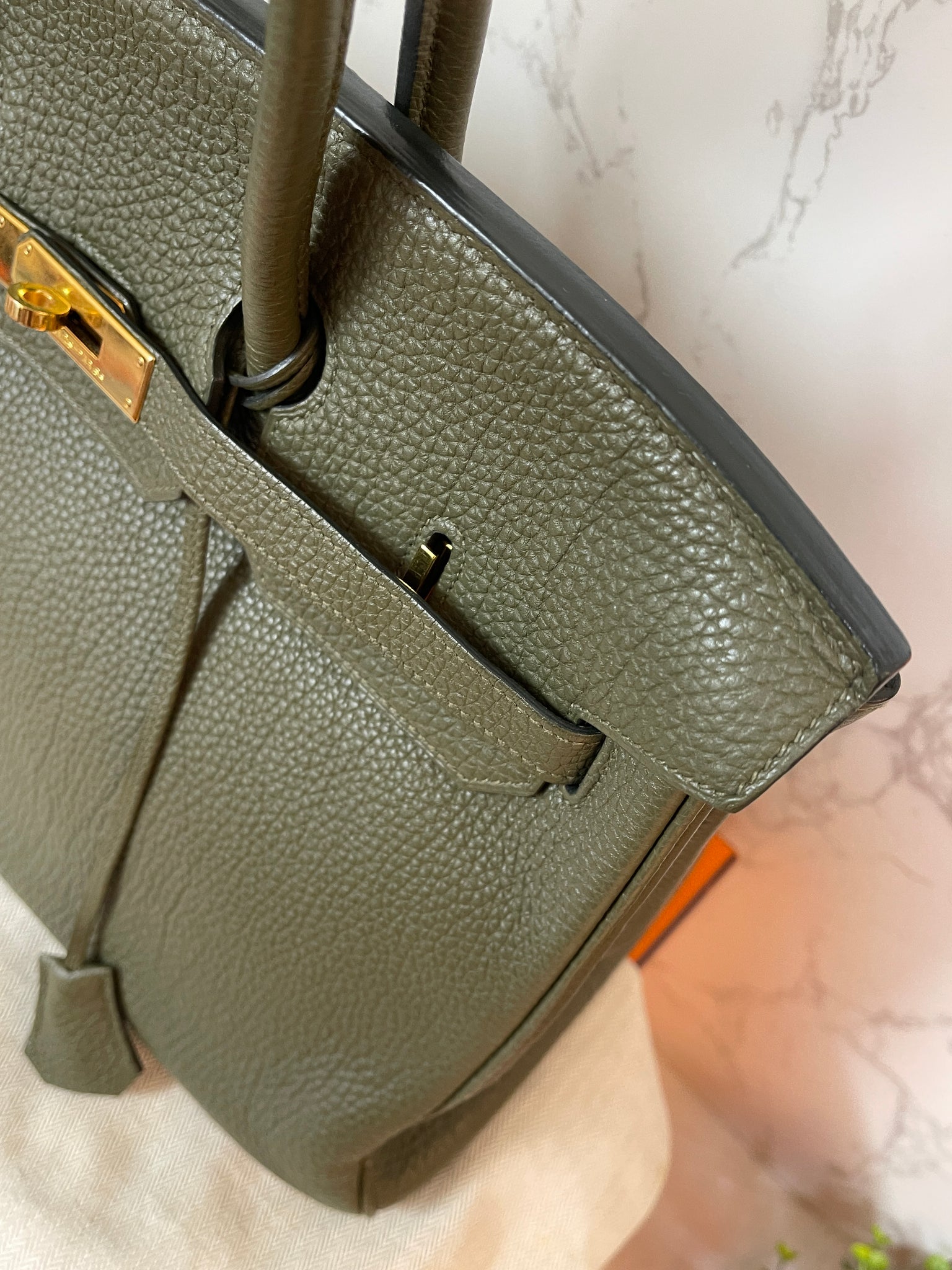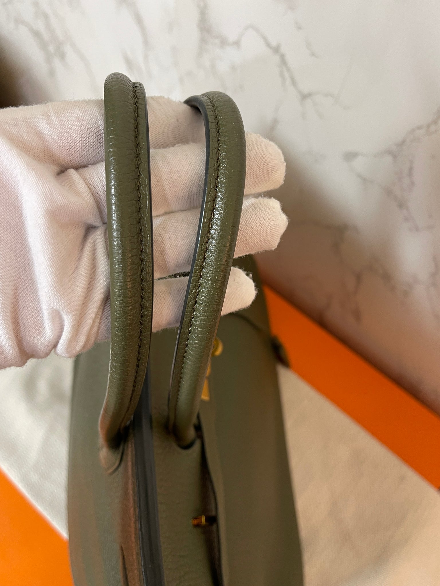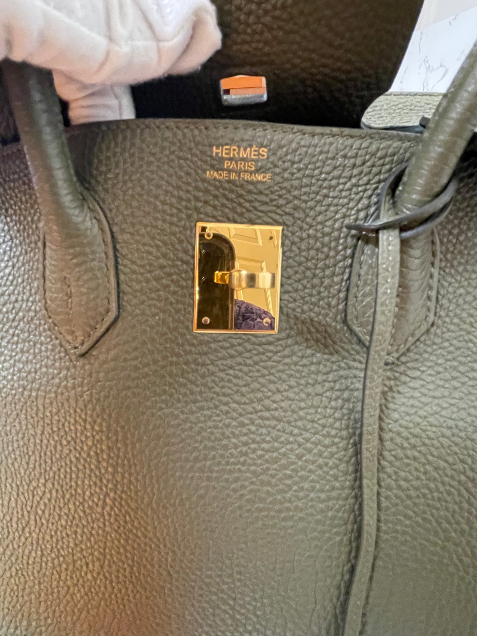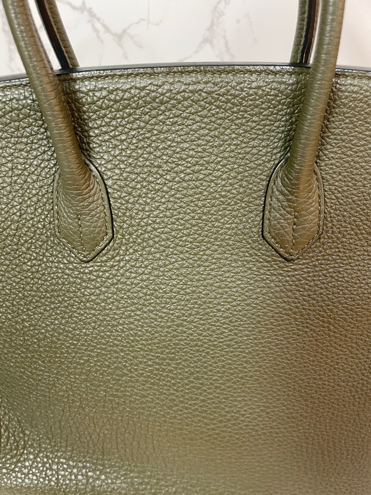 The Interior is lined in Vert Olive chevre with one zip pocket with a Hermes engraved zipper pull and an open pocket on the opposite side.