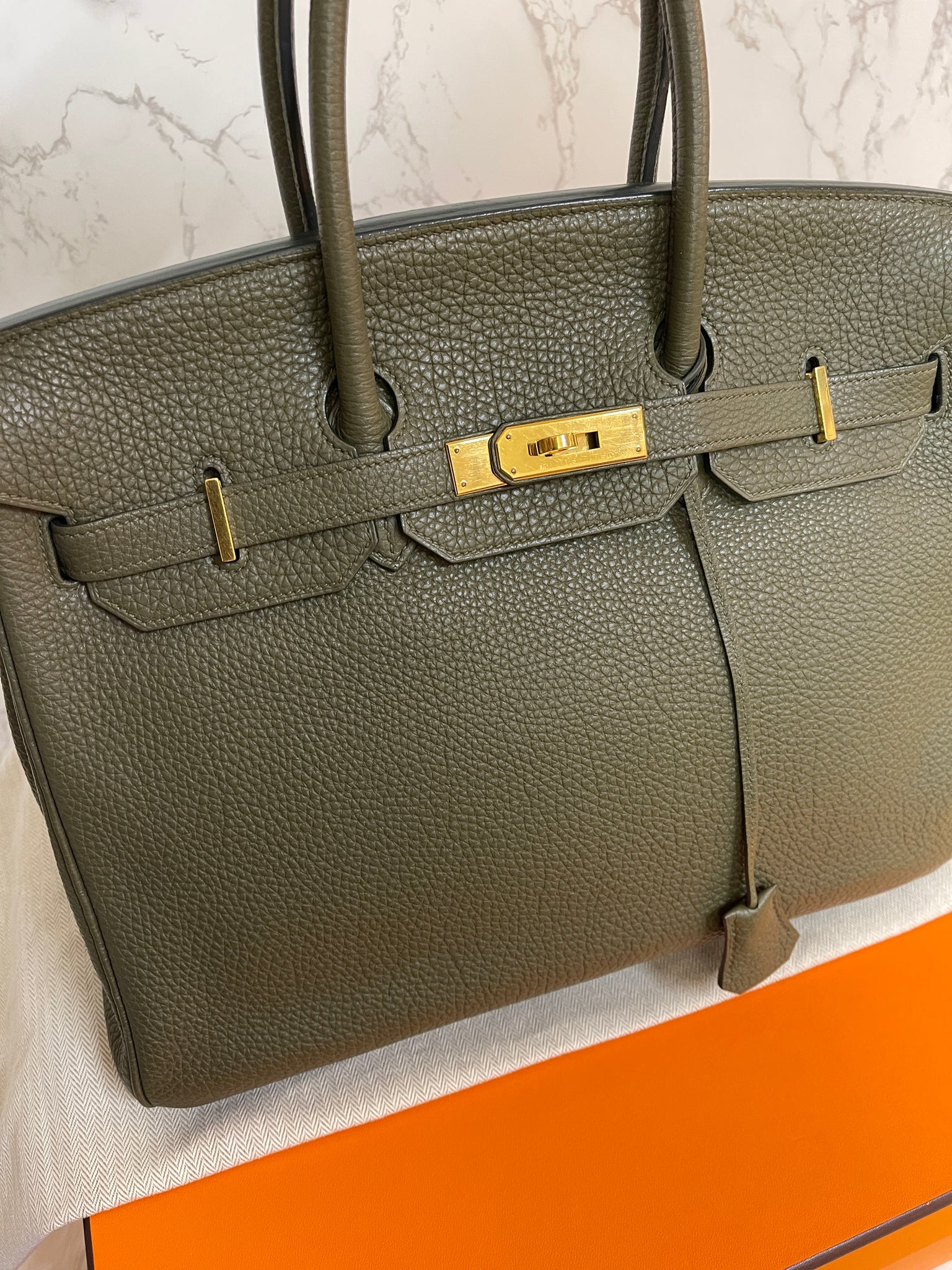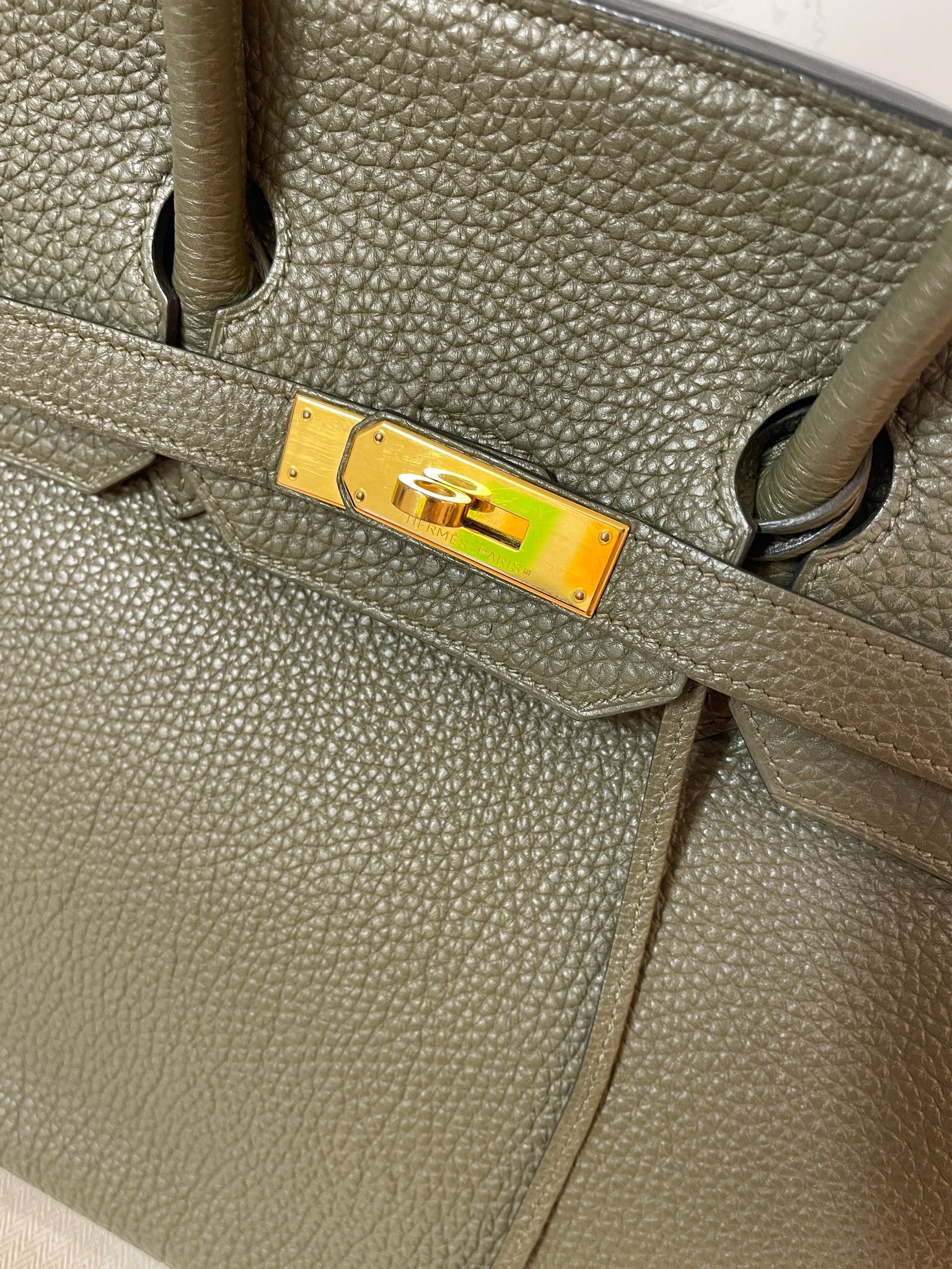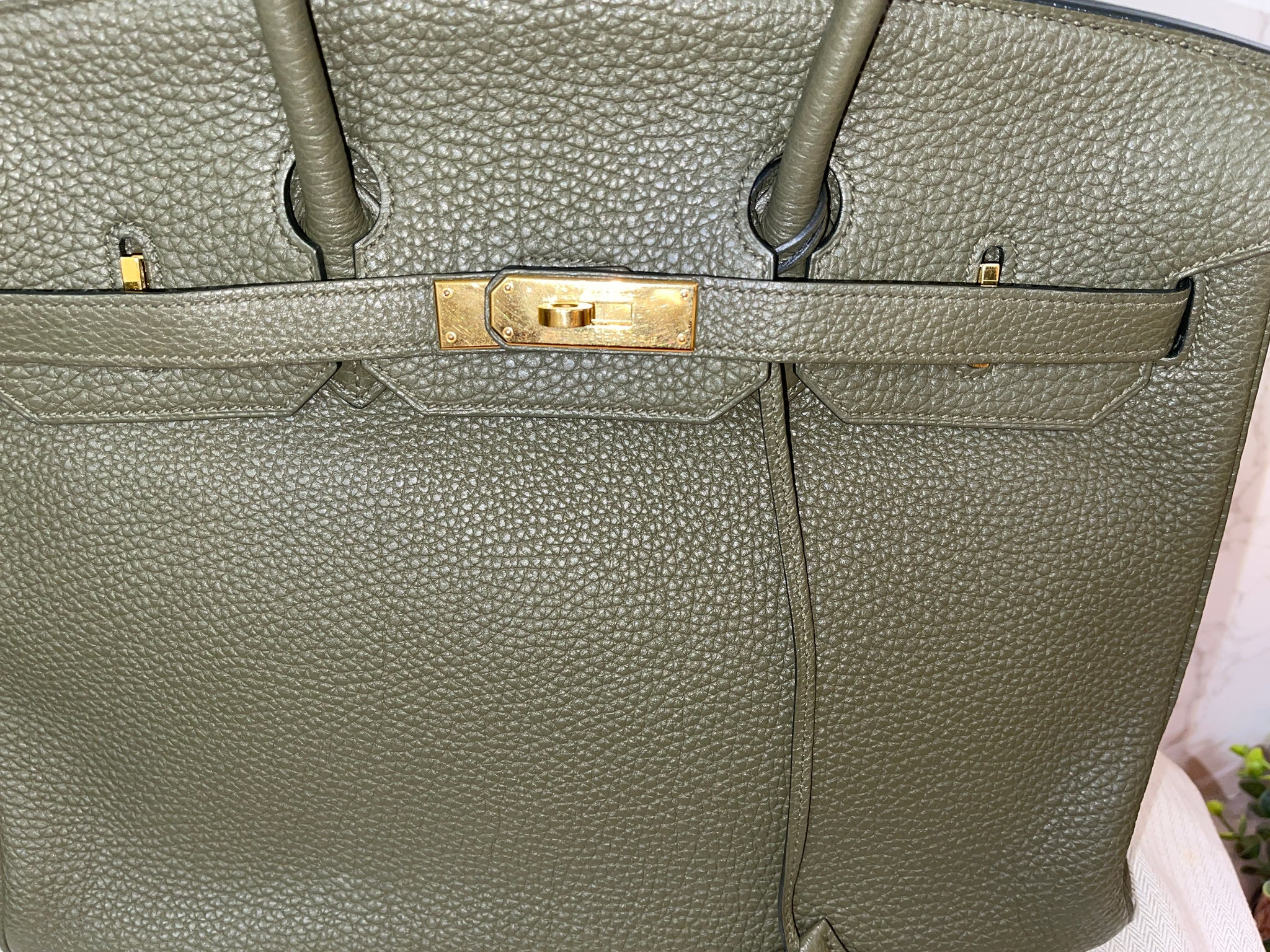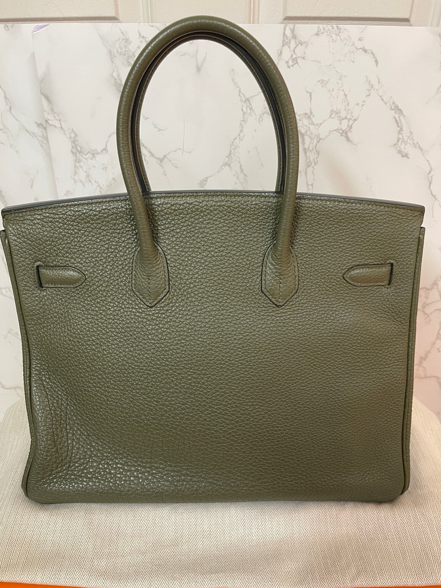 This Birkin features tonal stitching, front toggle closure, clochette with lock and two keys, and double rolled handles.