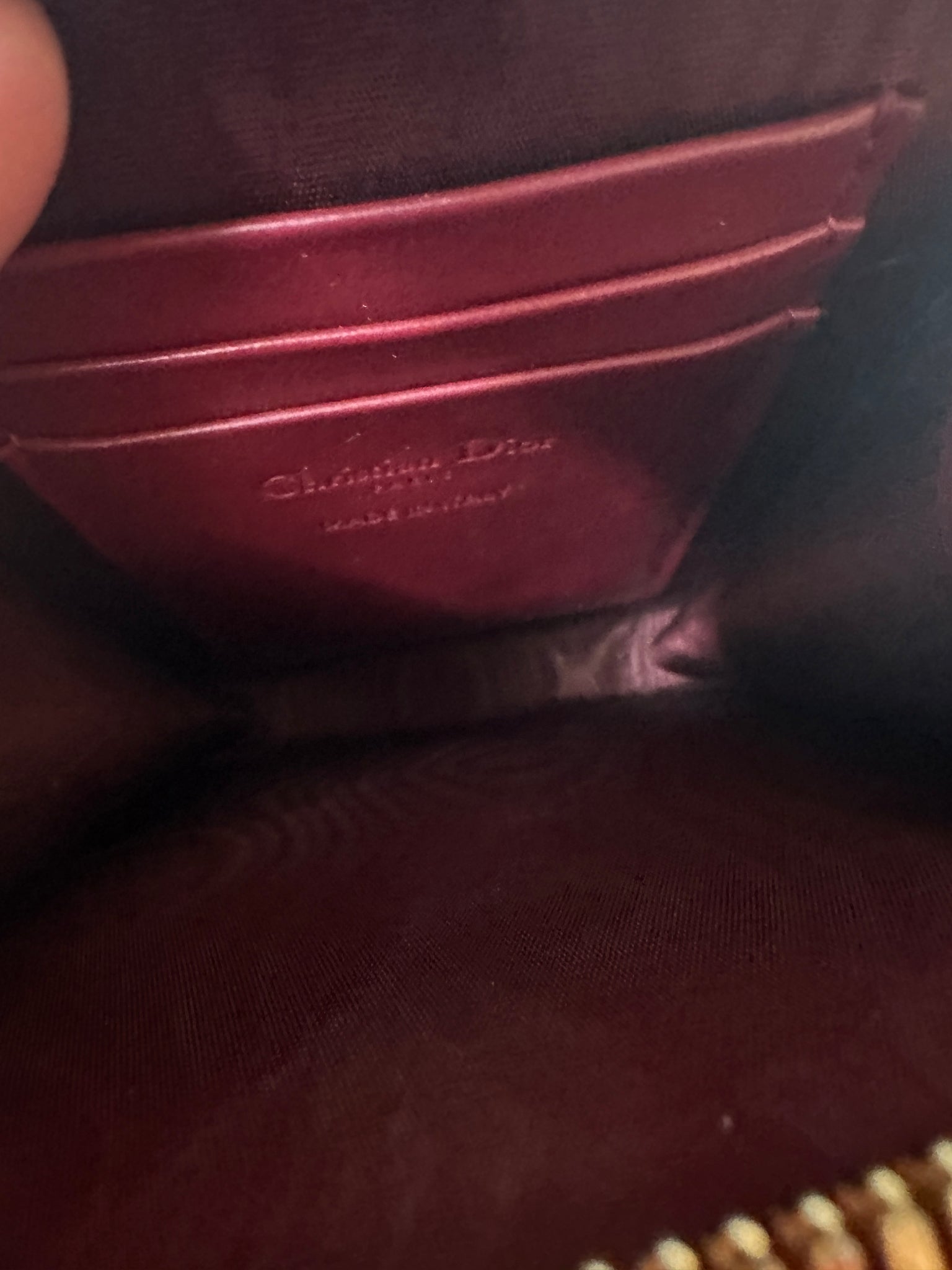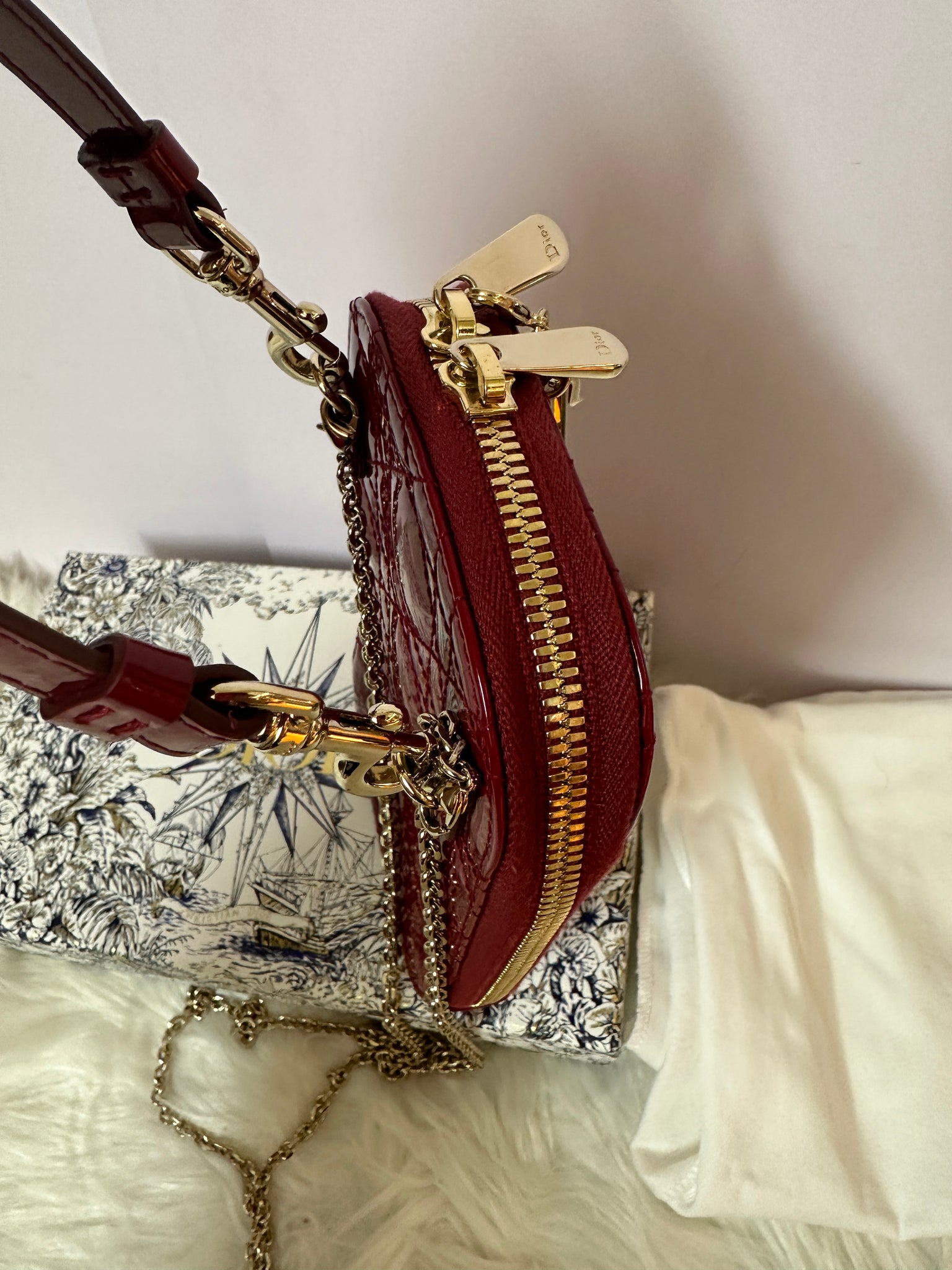 The Lady Dior Call'in Dior phone holder is both sophisticated and ingenious. Crafted in cherry red Cannage patent calfskin, the accessory features detachable D.I.O.R. charms. The phone holder may be carried by hand or worn crossbody thanks to its handle and chain strap.