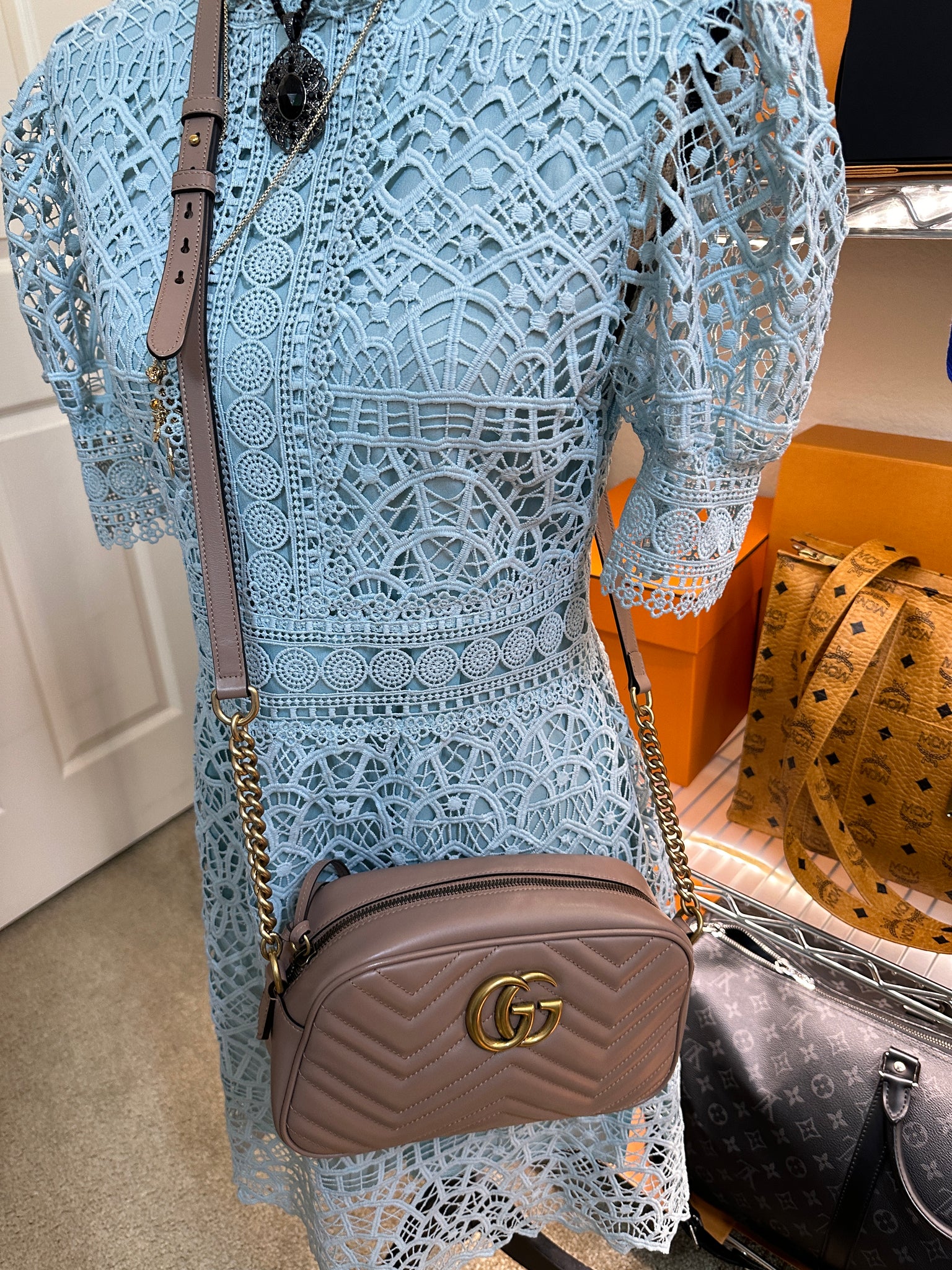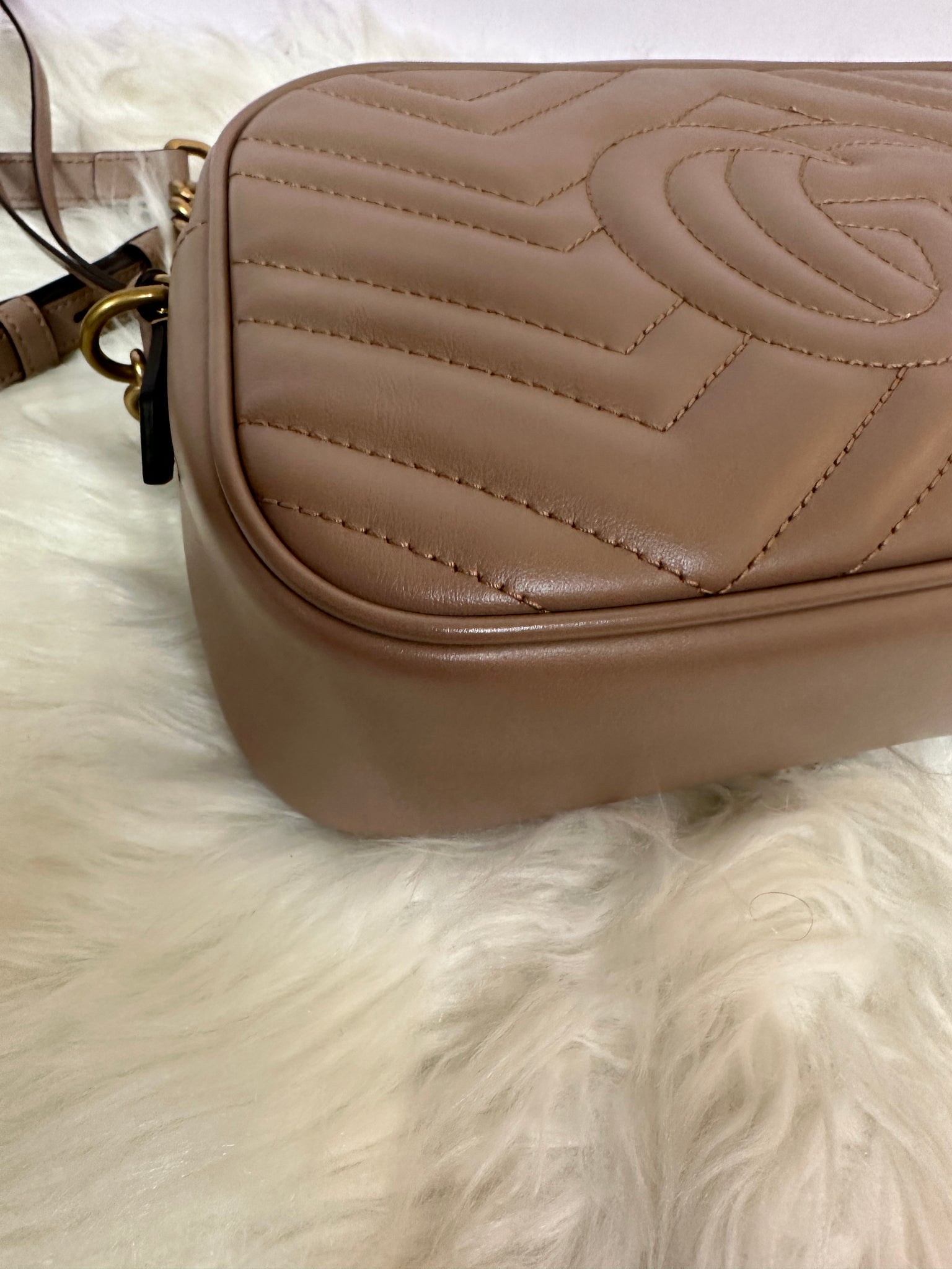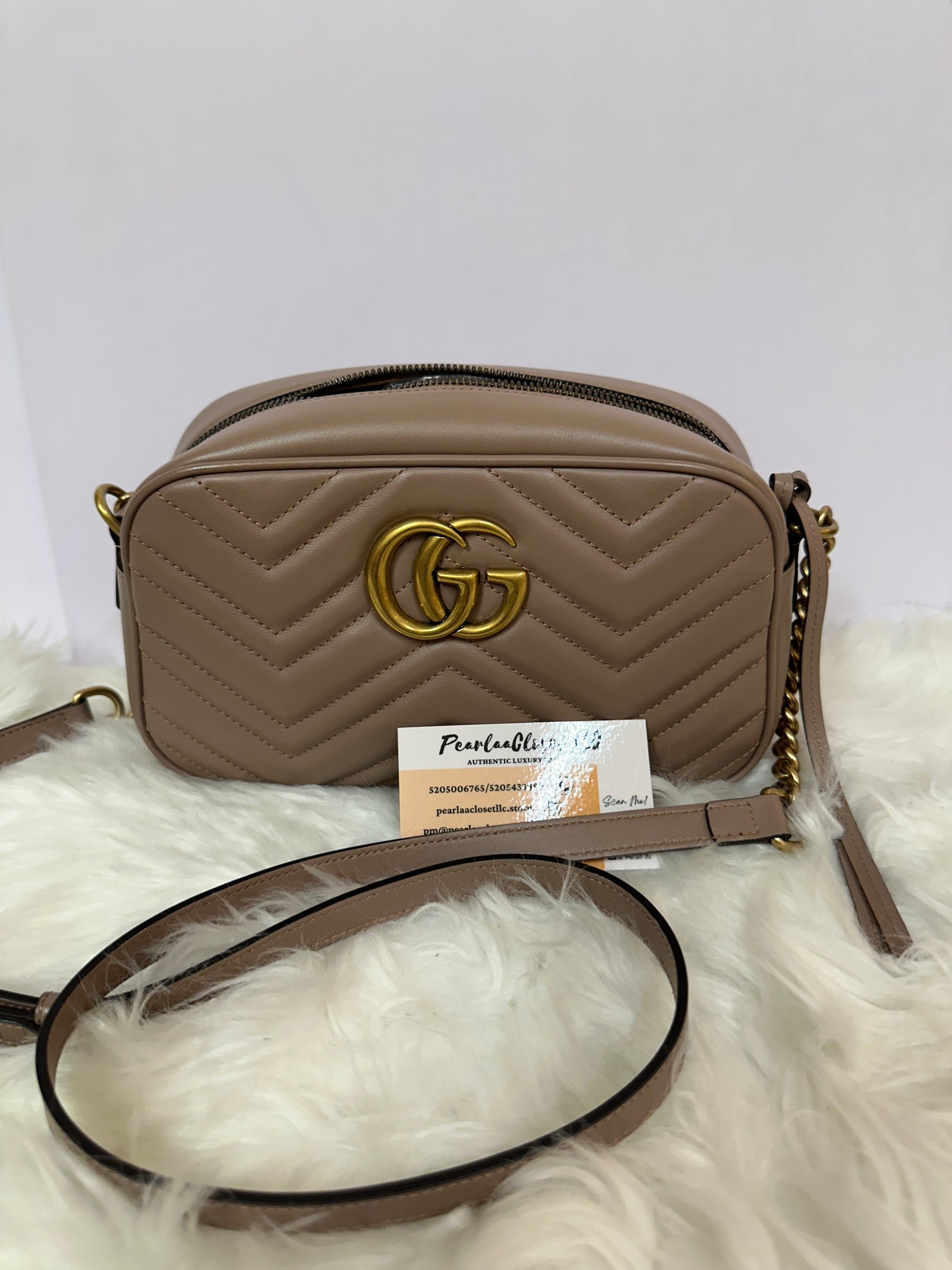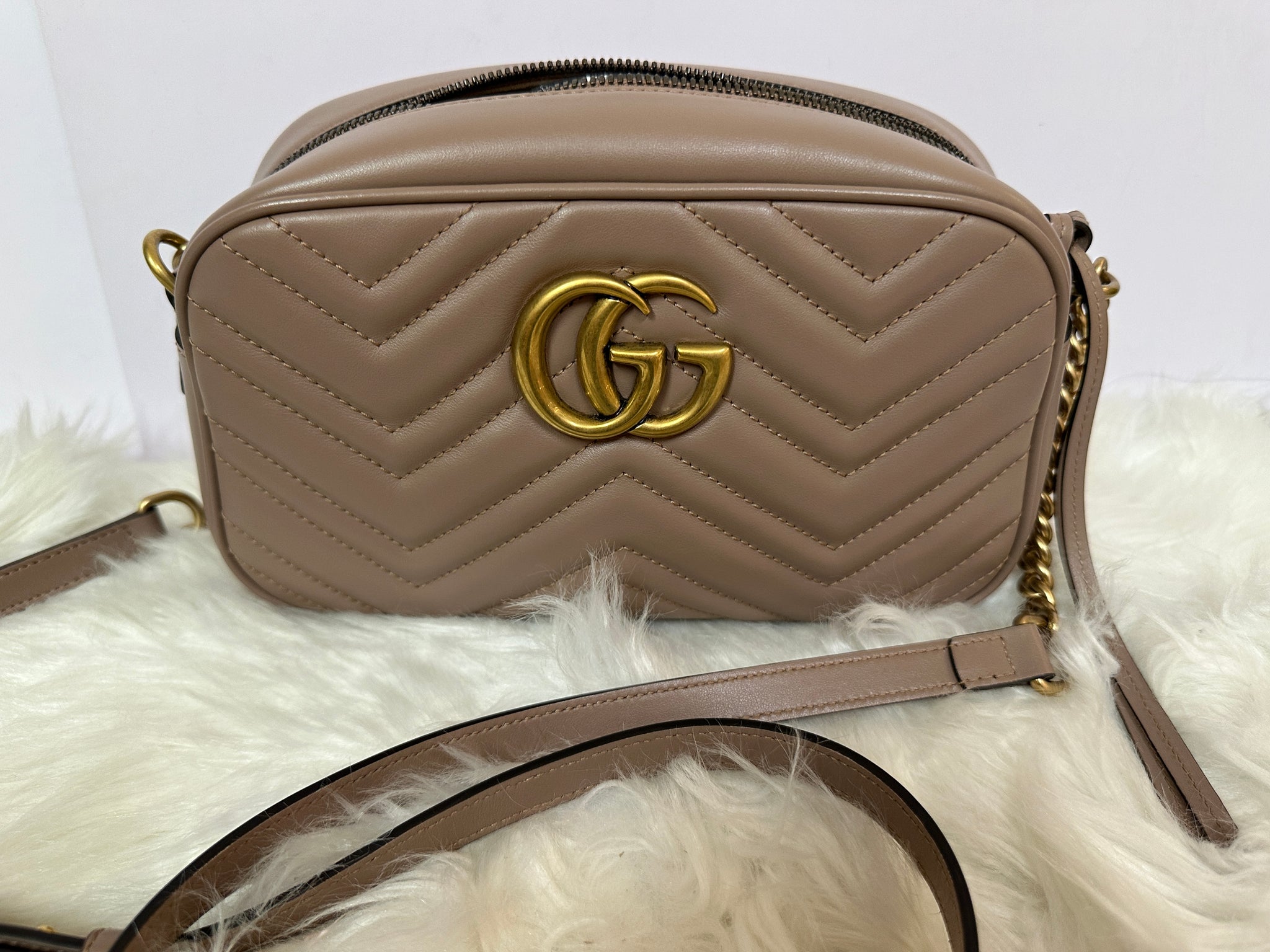 This shoulder bag is crafted of calfskin leather in dark beige. This crossbody bag features an antiqued gold chain leather shoulder strap and an interlocking antiqued gold GG logo on the front. The top zipper opens to a nude microfiber interior with a patch pocket.