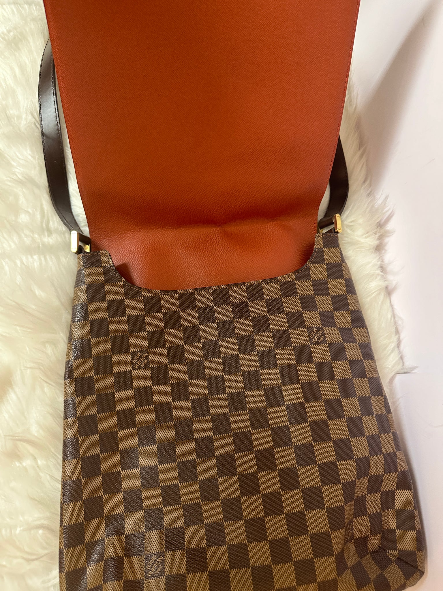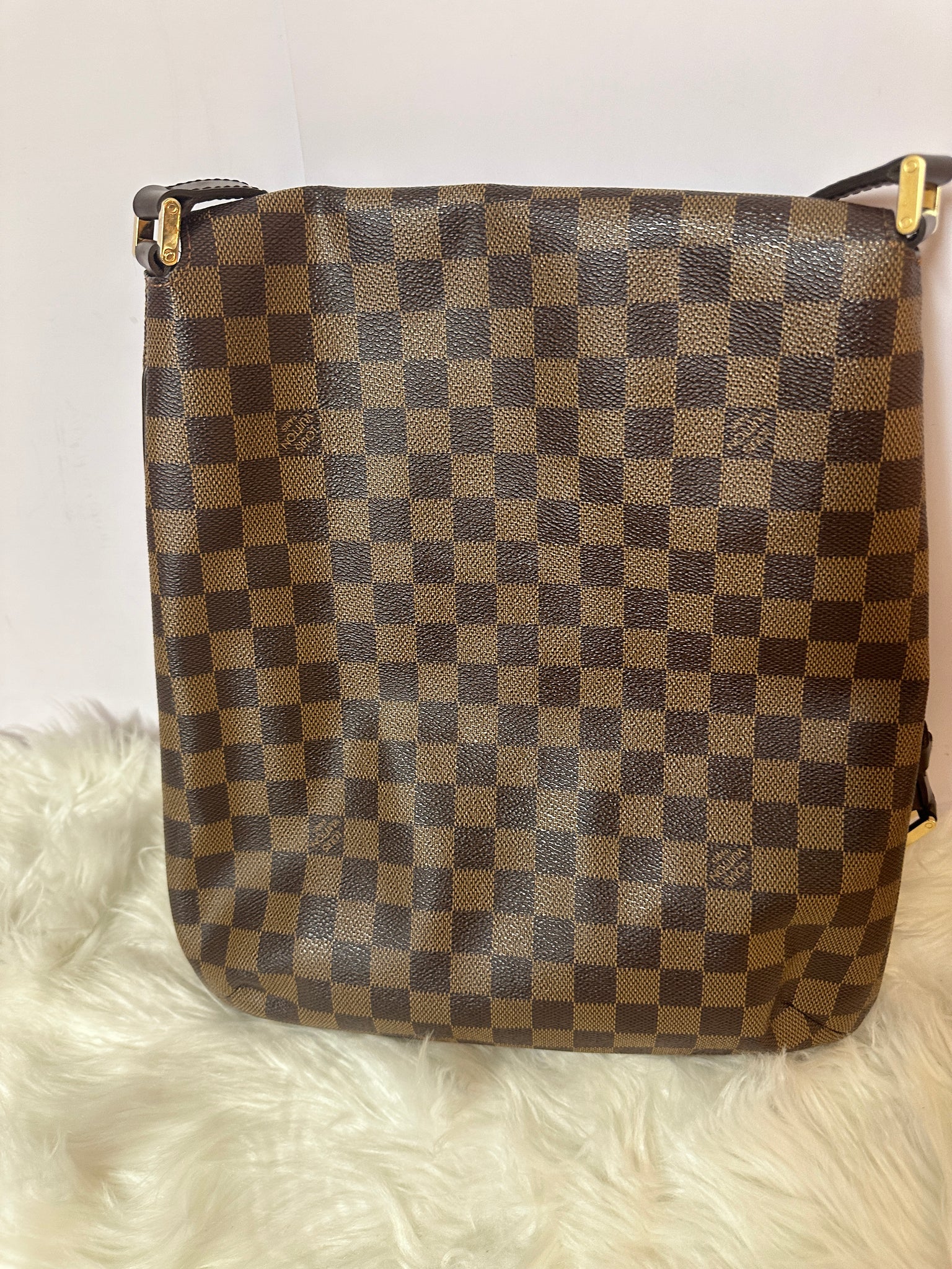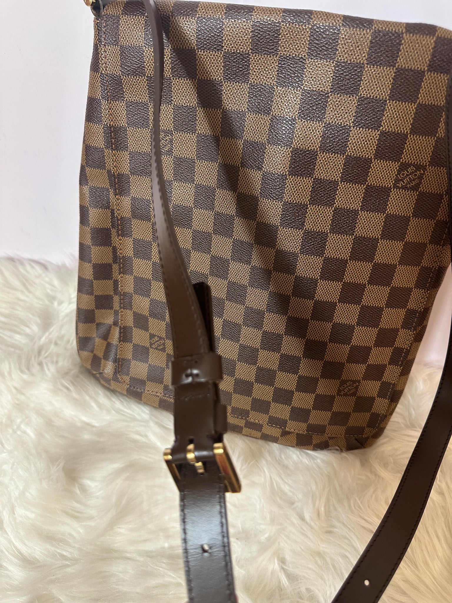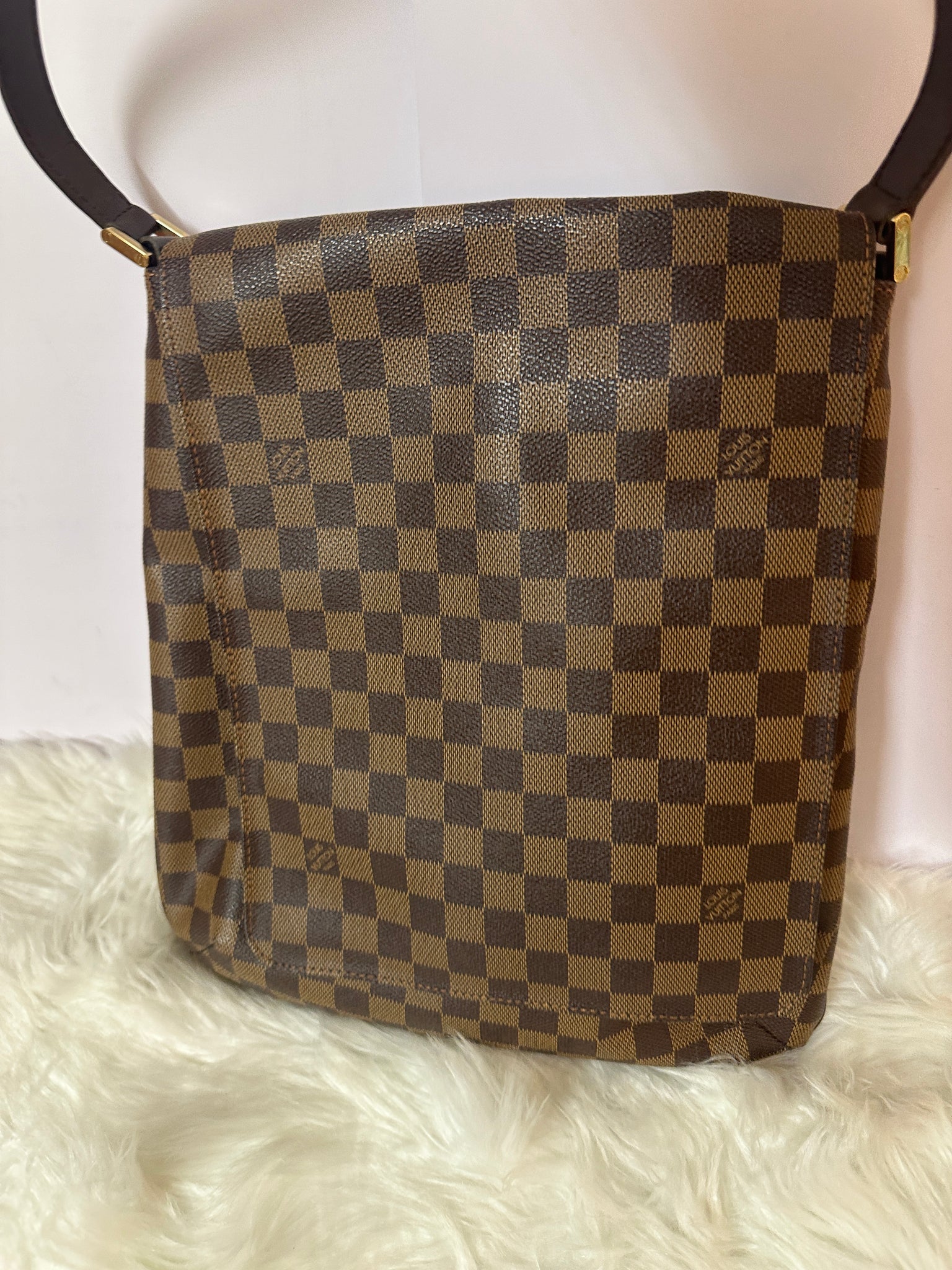 This discontinued petite shoulder bag from the Musette series, is crafted in the house's iconic Damier Ebene coated canvas, featuring tonal leather trim and finished with gold-tone brass hardware.
