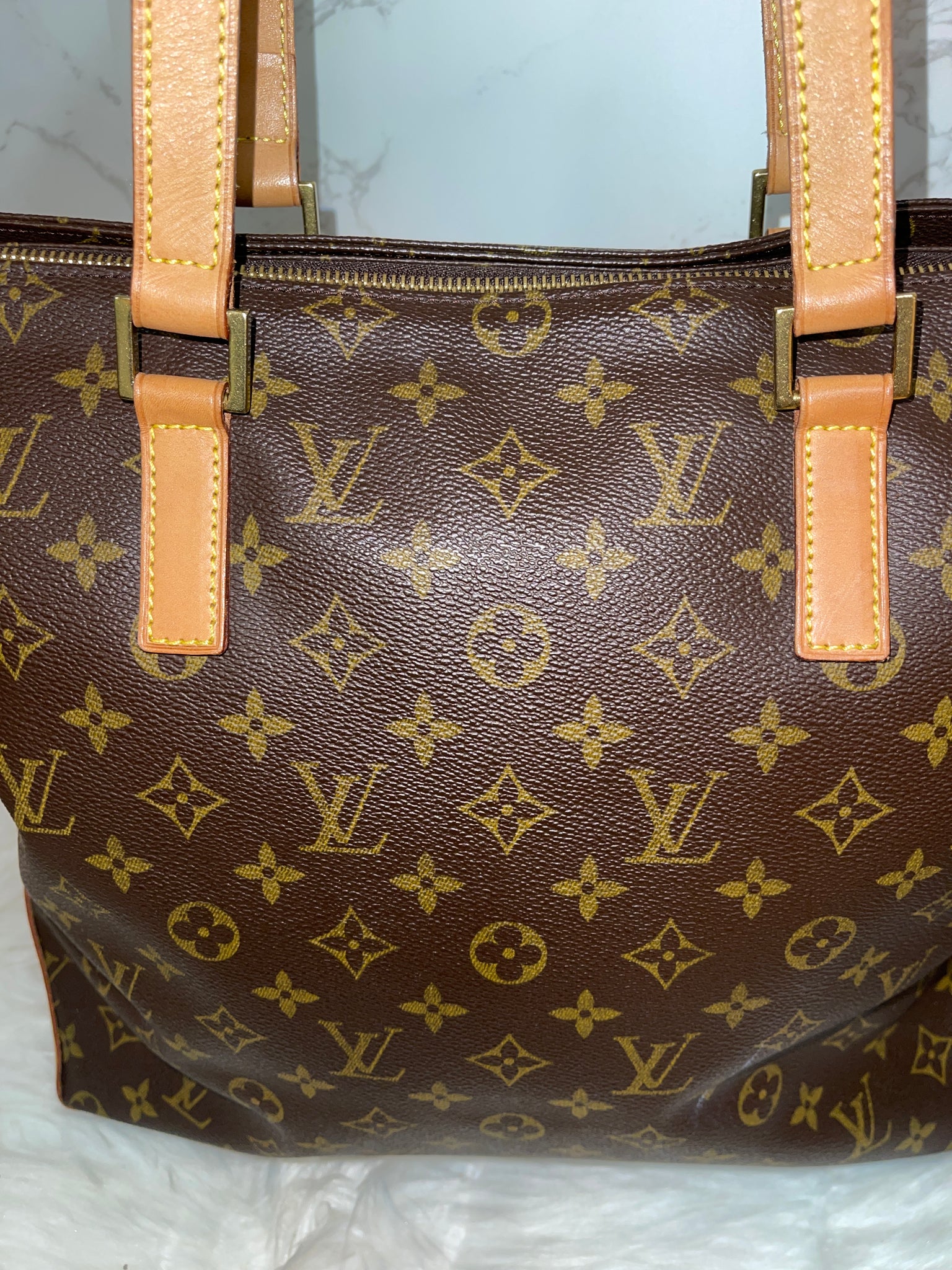 This is an authentic LOUIS VUITTON Monogram Cabas Mezzo. This chic shoulder bag is crafted of traditional Louis Vuitton monogram-coated canvas. The bag features vachetta cowhide leather shoulder straps with brass links and a zipper top. This opens to a spacious cocoa fabric interior with a flat pocket. This is a marvelous shoulder bag, ideal for everyday use, from Louis Vuitton!
