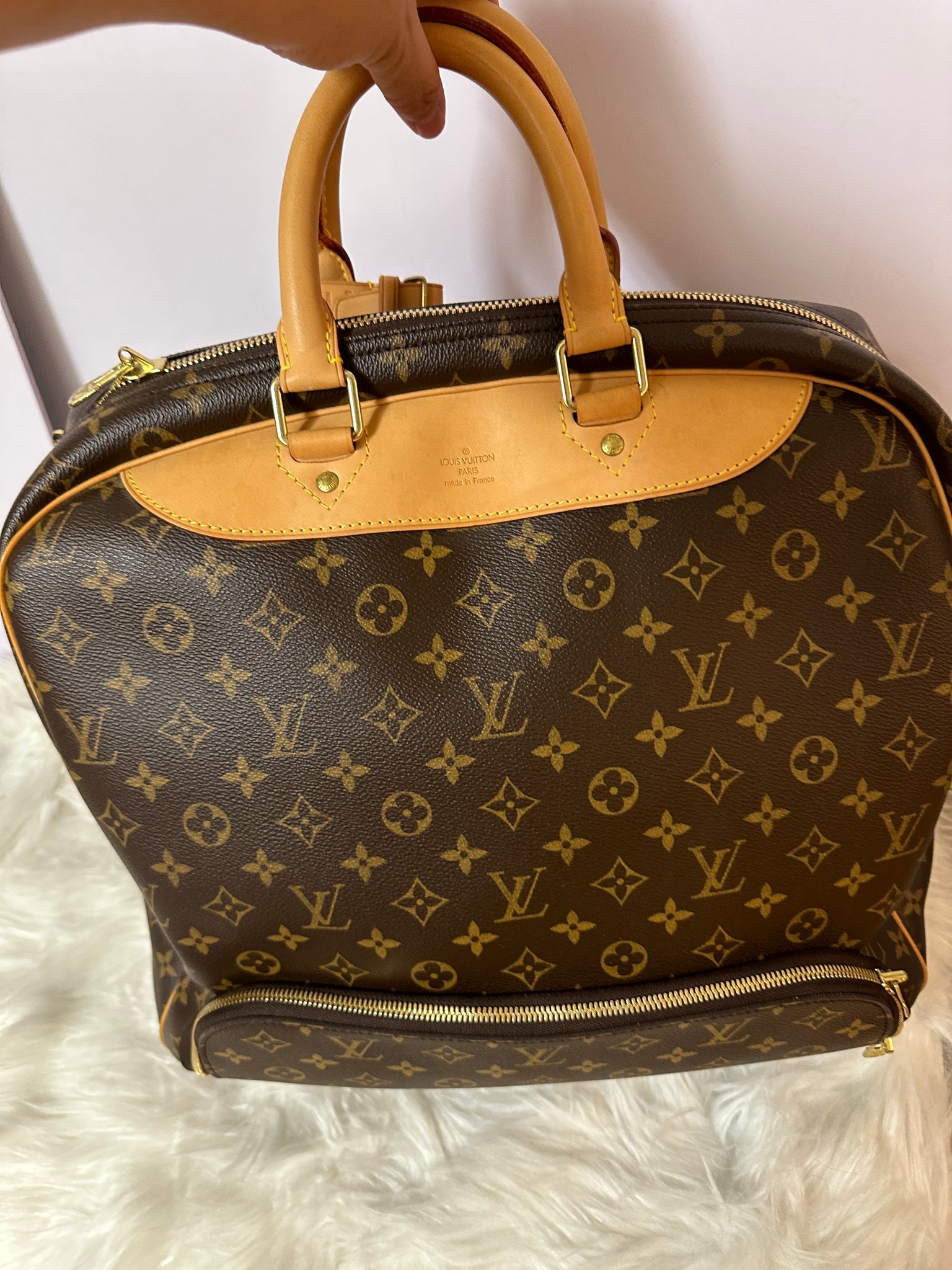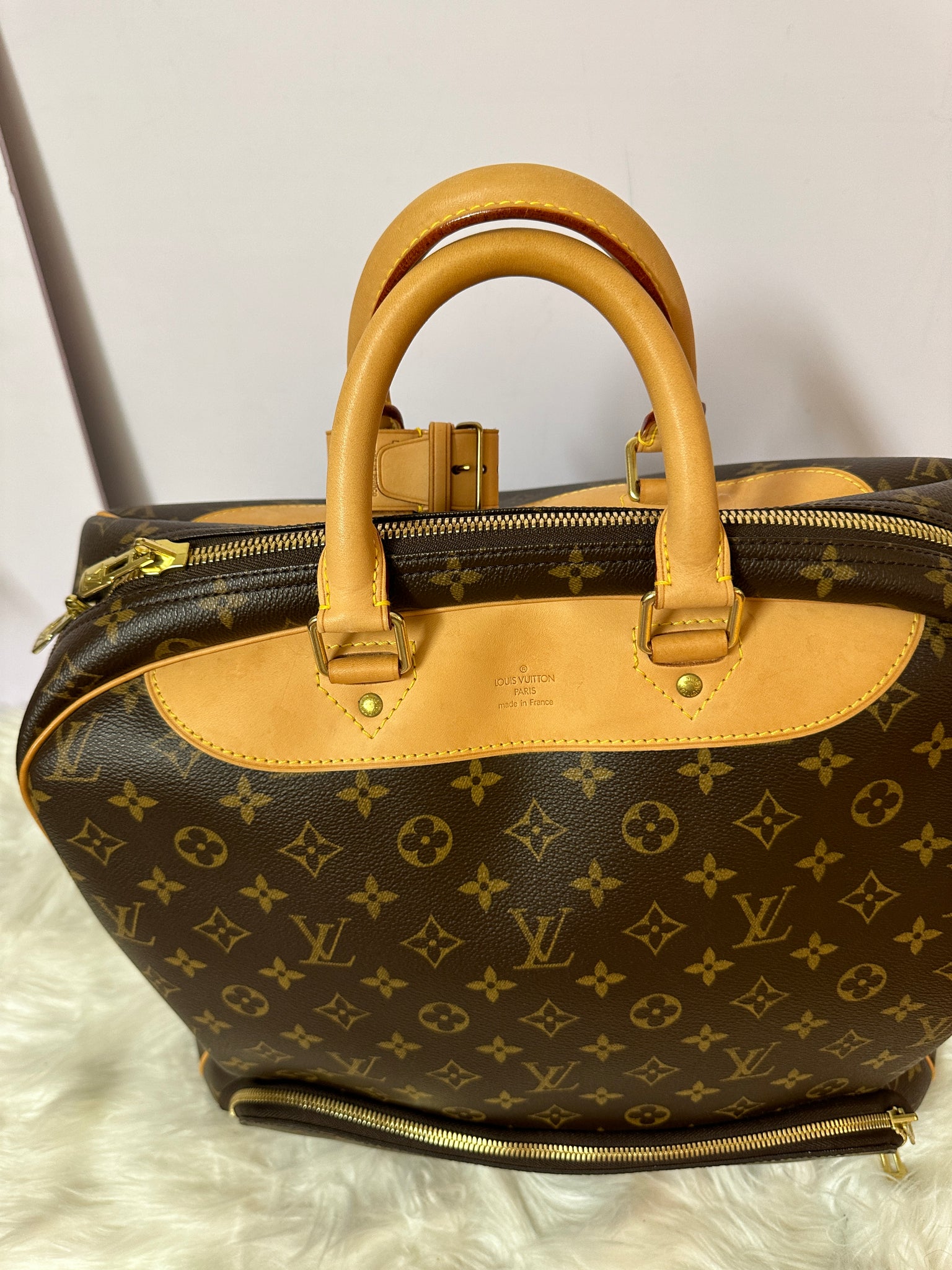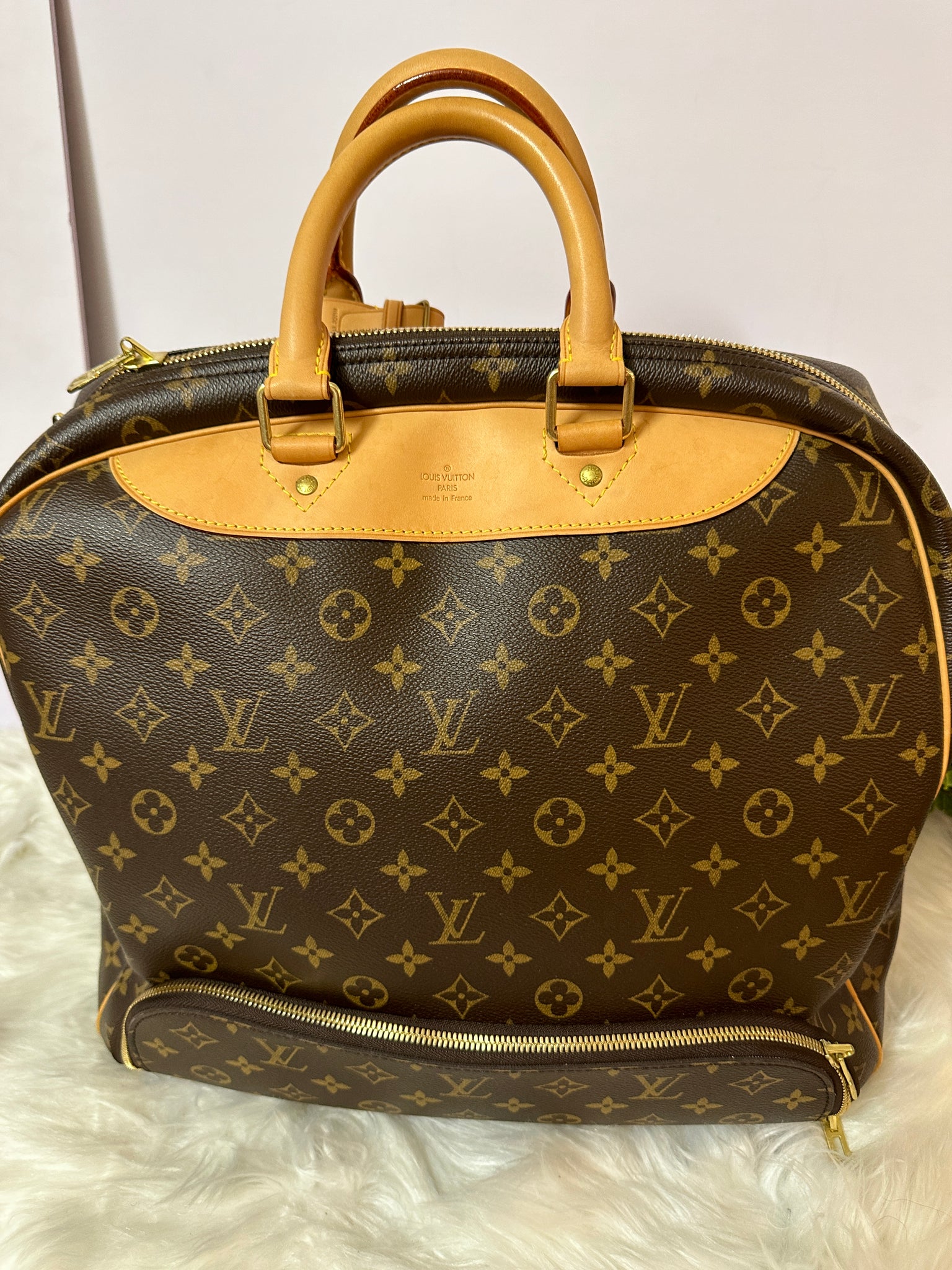 This stylish sports travel bag is crafted of Louis Vuitton monogram on toile canvas. The bag features rolled and reinforced vachetta leather top handles set on leather anchors with brass links, a vachetta leather tag, a sturdy wrap-around brass zipper and an external shoe compartment. This zipper opens to a spacious stain-resistant ivory interior with a hanging patch pocket.