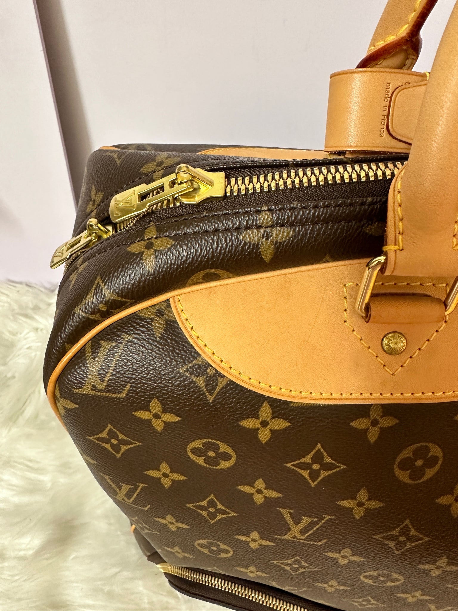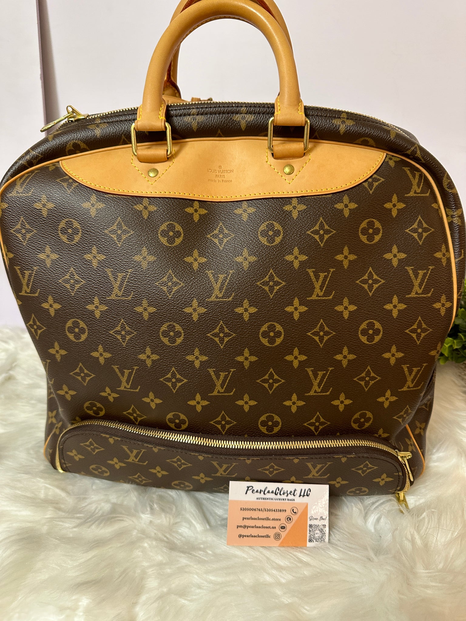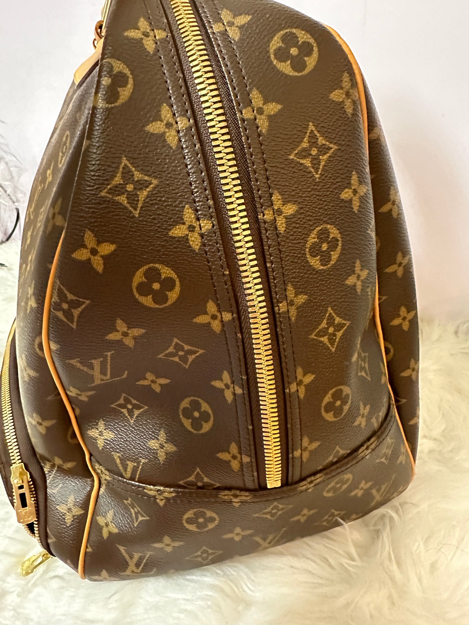This stylish sports travel bag is crafted of Louis Vuitton monogram on toile canvas. The bag features rolled and reinforced vachetta leather top handles set on leather anchors with brass links, a vachetta leather tag, a sturdy wrap-around brass zipper and an external shoe compartment. This zipper opens to a spacious stain-resistant ivory interior with a hanging patch pocket.
