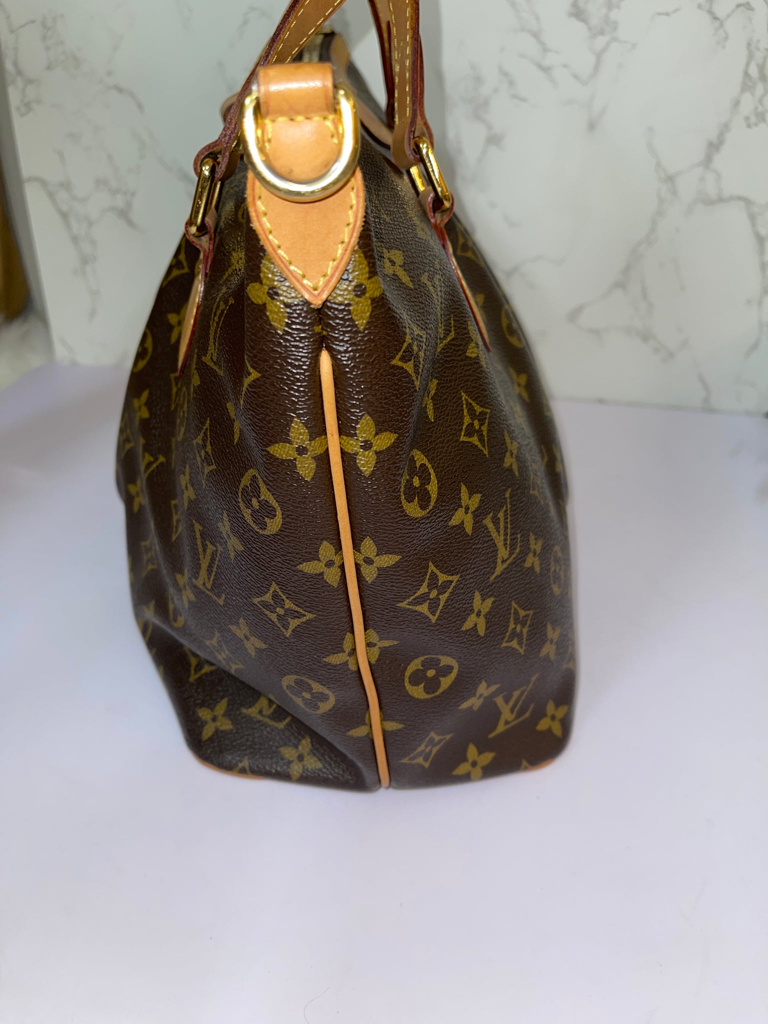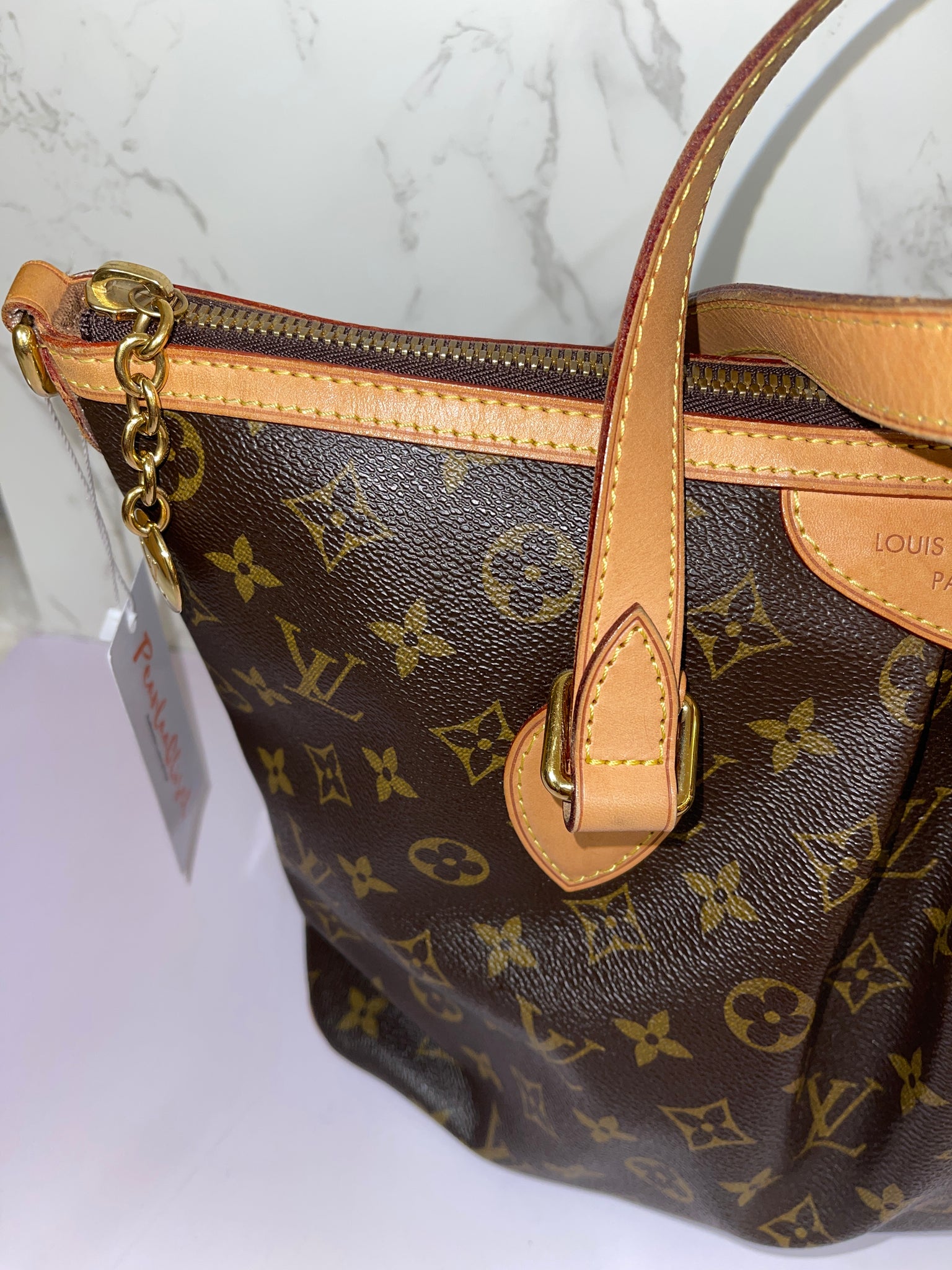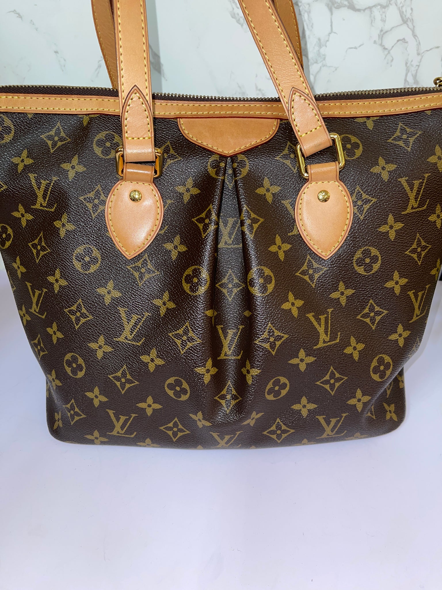 This is an authentic LOUIS VUITTON Monogram Palermo PM. This popular tote is crafted of Louis Vuitton monogram coated canvas and is pleated stylishly at the center. The shoulder bag features vachetta cowhide leather top handles, an optional shoulder strap, piping, and trim with polished brass hardware including an LV monogram zipper pull charm. The top zips open to a cocoa brown fabric interior with patch pockets.